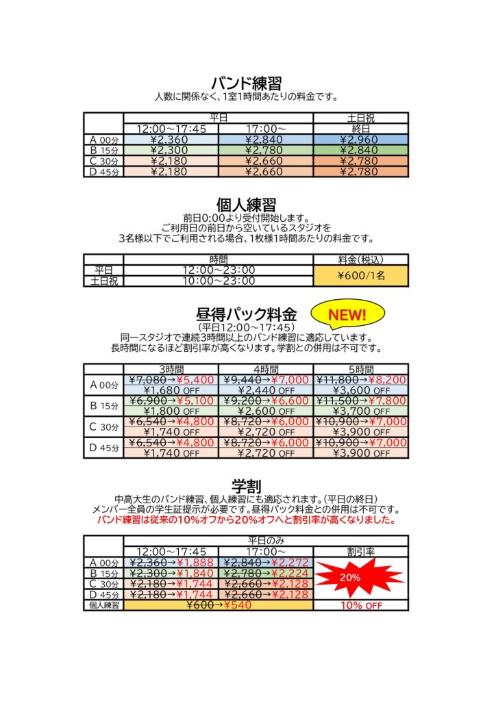 この度、日本橋店のスタジオ料金ならびに各種割引について2026/4/1(水)より改定させていただくことになりました。個人練習料金は現行のままとさせていただきます。今後とも皆様の音楽活動の場としてより快適な環境とサービスを提供するためスタッフ一同全力で努めて参ります。
